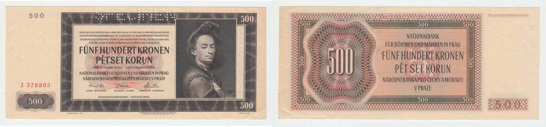 500 Koruna 1942 - 1.vyd.- série J, BHK.35 "SPECIMEN"