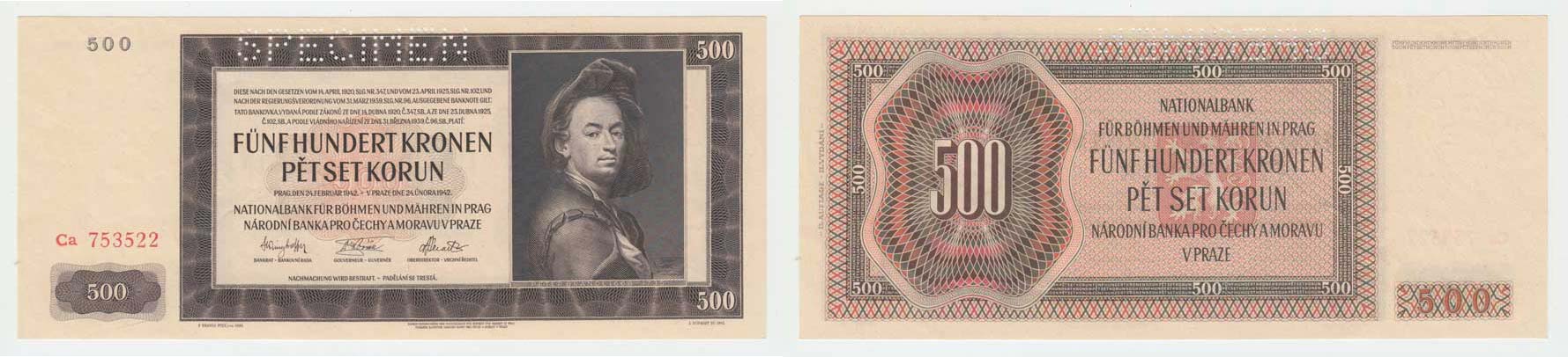 500 Koruna 1942 - 2.vyd.- sér. Ca, BHK.36 "SPECIMEN"