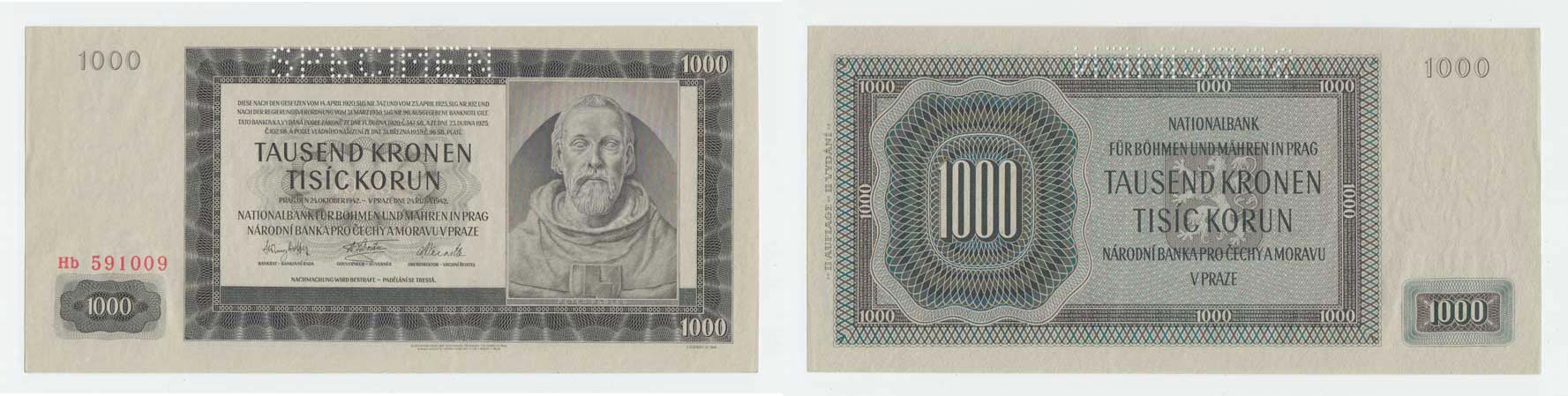 1000 Koruna 1942 - 2.vyd.- sér.Hb, BHK.39a "SPECIMEN"