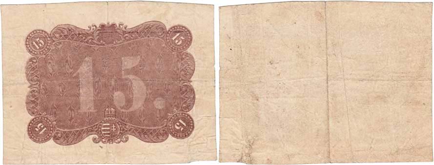 15 Krejcar 1849, jako Ri.411, jako Pick.S121, ale pouze hnědý podtisk aversu bankovky RR!