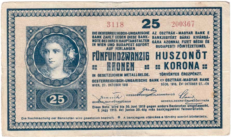 25 Koruna 1918, Pick.13, Ri.448b - sér.3118 - platná také na části území Slovenska okupované Maďarskou republikou rad