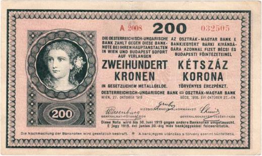 200 Koruna 1918, Pick.15, Ri.449a - sér.A2008 - plat. také na části území Slovenska okupované Maďarskou republikou rad, revers bez rastru