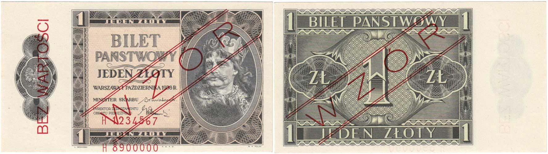 1 Zlotý 1938 - přetisk "WZOR", dva číslovače, jako Pick.50, Mil.78.Wa RR!