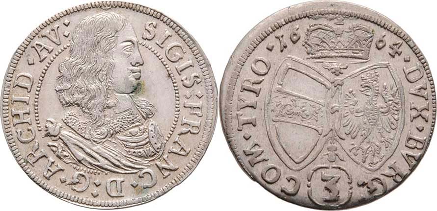 3 Krejcar 1664, Hall, M-A.163, 1.580g, skvrnka, patina, téměř