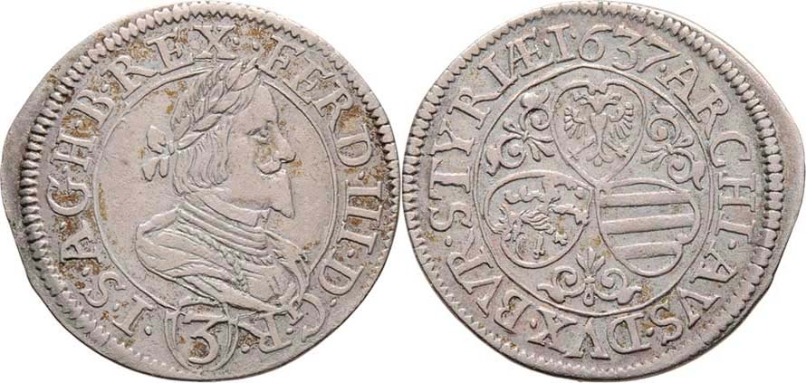 3 Krejcar 1637, Štýrský Hradec, M-A.134, 1.899g, mírně exc., nep.nedor., patina