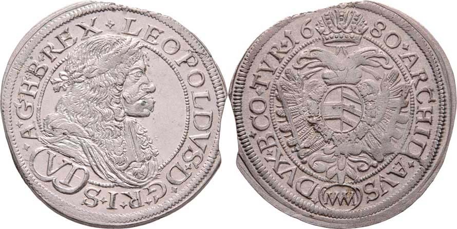 VI Krejcar 1680, Vídeň-Mittermayer, Nech.1939, M-A.179, 3.562g, krajový střížek, pěkná patina, téměř
