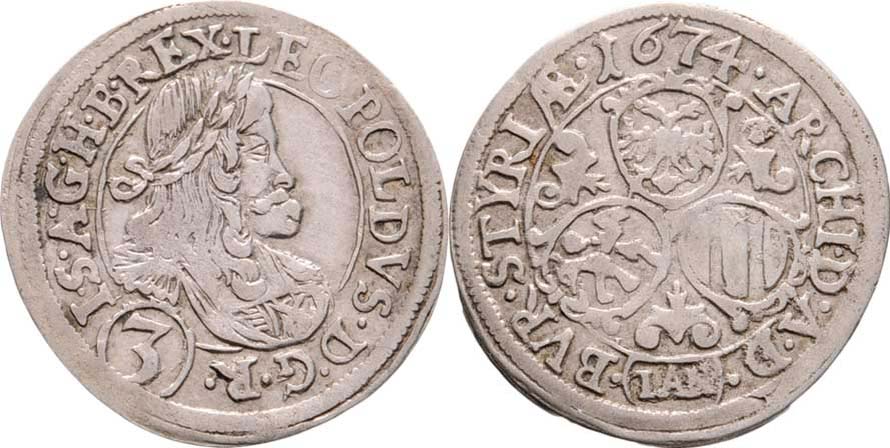 3 Krejcar 1674 IAN, Štýrský Hradec, Nech.2219, M-A.173, 1.710g, nep.nedor., pěkná patina, téměř