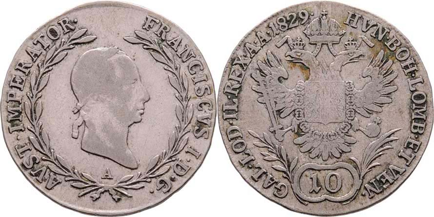 10 Krejcar 1829 A, Vídeň, 3.804g, vlas.rysky, patina RR!