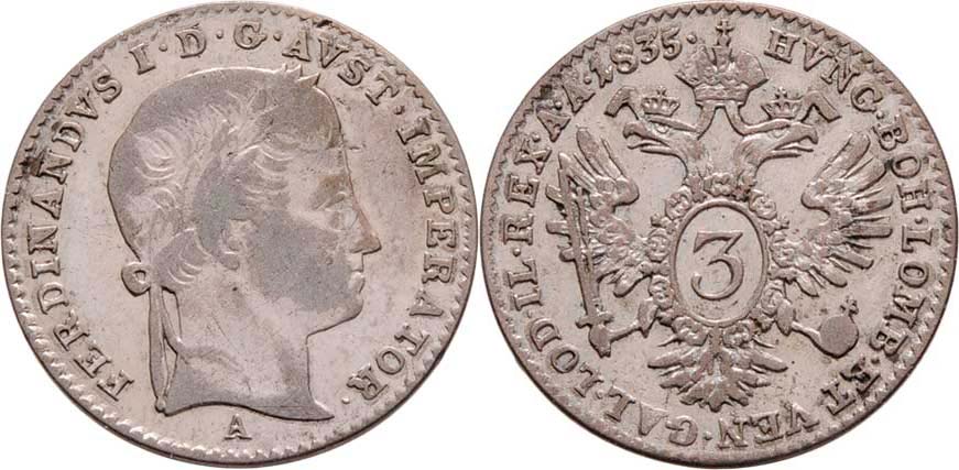 3 Krejcar 1835 A - FERDINANDVS, Vídeň, 1.656g, dr.hr., dr.rysky, patina R!