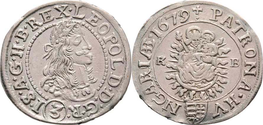 3 Krejcar 1679 KB, Kremnica, Nech.1219, Husz.1465, 1.668g, mírně zvlněný, pěkná patina, téměř
