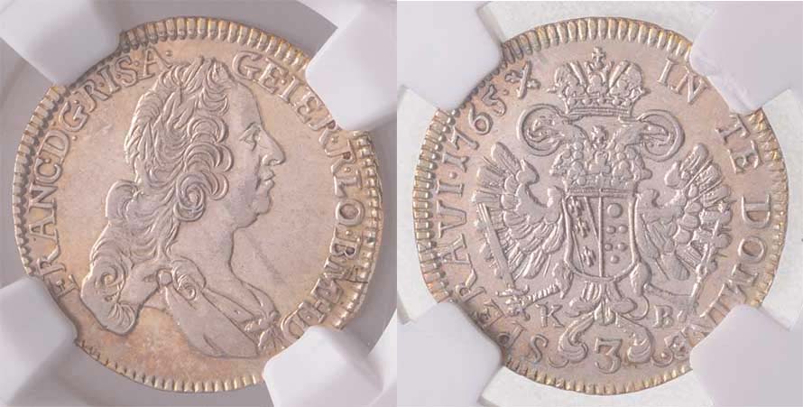 3 Krejcar 1765 KB, Kremnica, N.31, mince zatavena v etui "NGC", uvedena zachov. XF45, pěkná patina, téměř