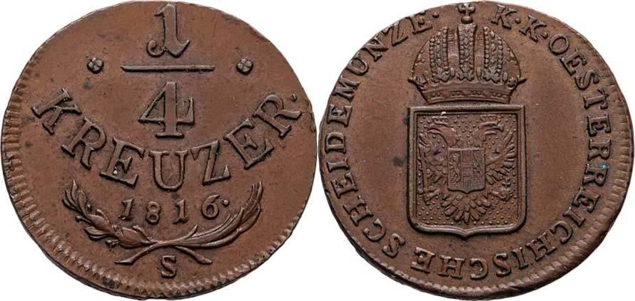 Cu 1/4 Krejcar 1816 S, Smolník, 2.567g, mírně exc., krásná patina