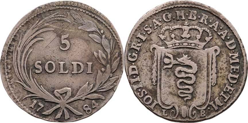 5 Soldi 1784 LB, Milán, P.41, Cr.41, 1.500g, zřetelné stopy přeražby, nep.exc., vl.rysky, patina R!