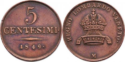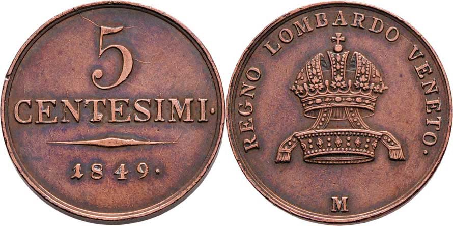 5 Centesimi 1849 M - větší typ, 8.555g, dr.hr., nep.rysky, nep.vady razidla, pěkná patina, téměř R!