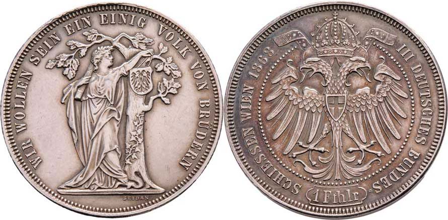 Tolar spolkový 1868 - III. německé spolkové střelby, 16.890g, nep.hr., vlas.rysky, pěkná patina R!