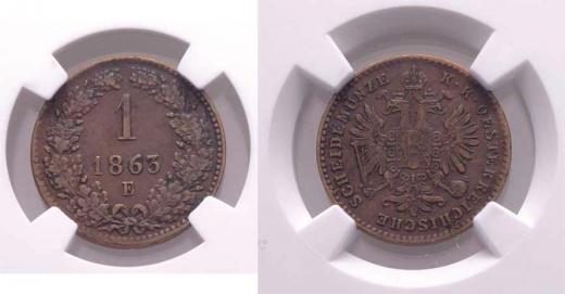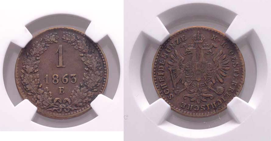Krejcar 1863 E - mince zatavená v etui NGC, uvedena zachovalost "XF45 BN"