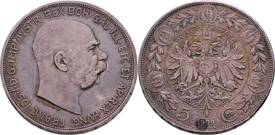 5 Koruna 1909 - Schwartz, 23.991g, dr.hr., dr.rysky, skvrnka v reversu, patina R!