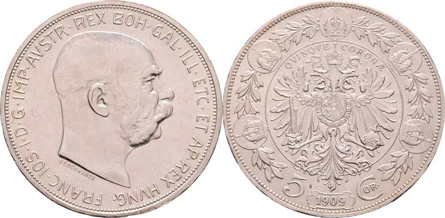 5 Koruna 1909 - Schwartz, 23.905g, nep.hr., dr.rysky v aversu