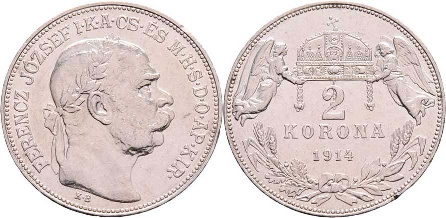 2 Koruna 1914 KB, 10.000g, dr.hr., nep.rysky, téměř R!