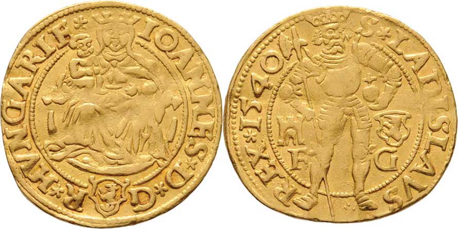 Dukát 1540, zn."hrad-F-štít-G", Klausenburg-Georgius, stojící sv.Ladislav, opis/ Madona, znak, opis, Fr.42, Husz.871, Len.157-1-1540, 3.571g, zvlněný, patina R!