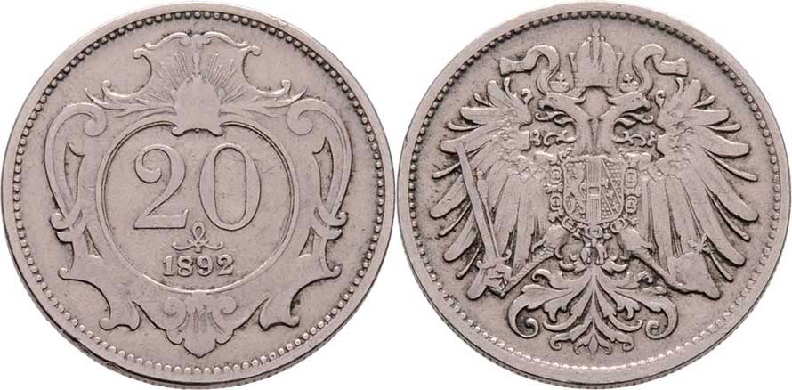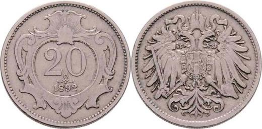 20 Haléř 1892, 3.918g, nep.hr., nep.rysky, pěkná patina R!