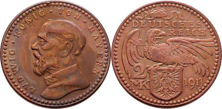 2 Marka 1913 - zkušební ražba, měď 28mm, 8.927g, Nesign.(K.Goetz), skvrny, patina RR!