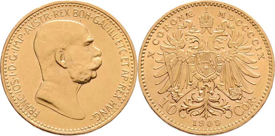 10 Koruna 1909-Marschall, 3.387g,