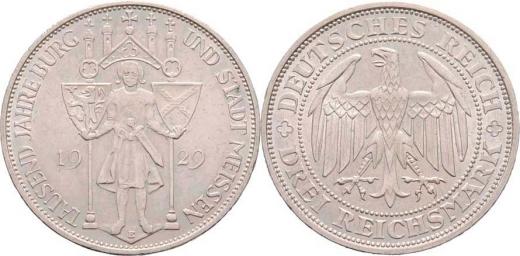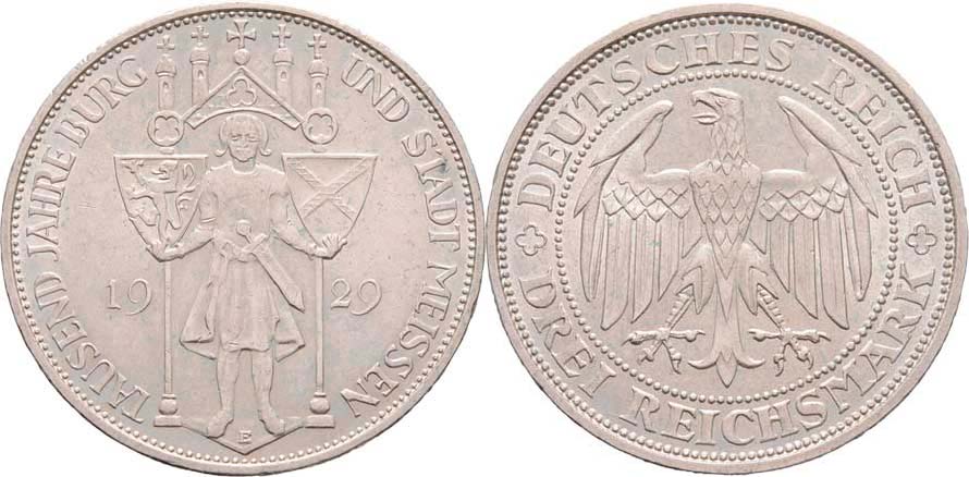 3 Marka 1929 E - Míšeň, KM.65 (Ag500), 14.883g, nep.hr., nep.rysky, patina, téměř