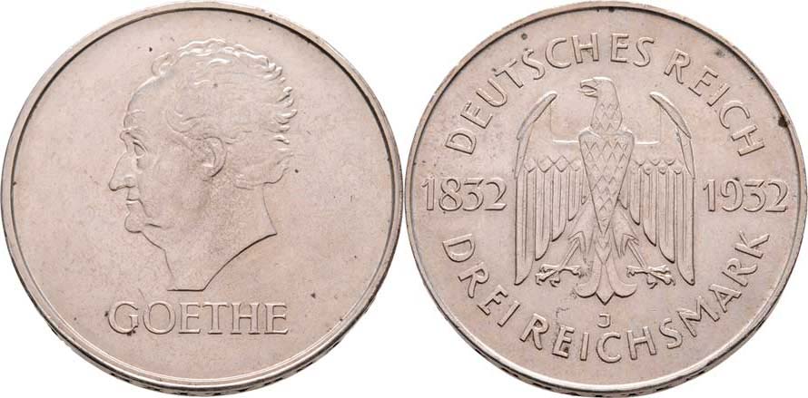 3 Marka 1932 J - Goethe, KM.76 (Ag500, pouze 33.000 ks), 15.111g, nep.hr., nep.rysky, skvrnky, patina
