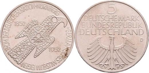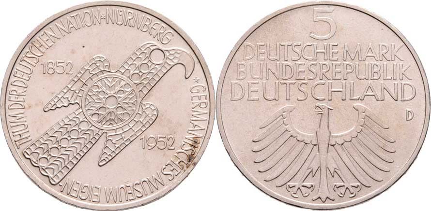 5 Marka 1952 D - Germanisches Museum, KM.113 (Ag625), 11.222g, nep.hr., nep.rysky, téměř RR!