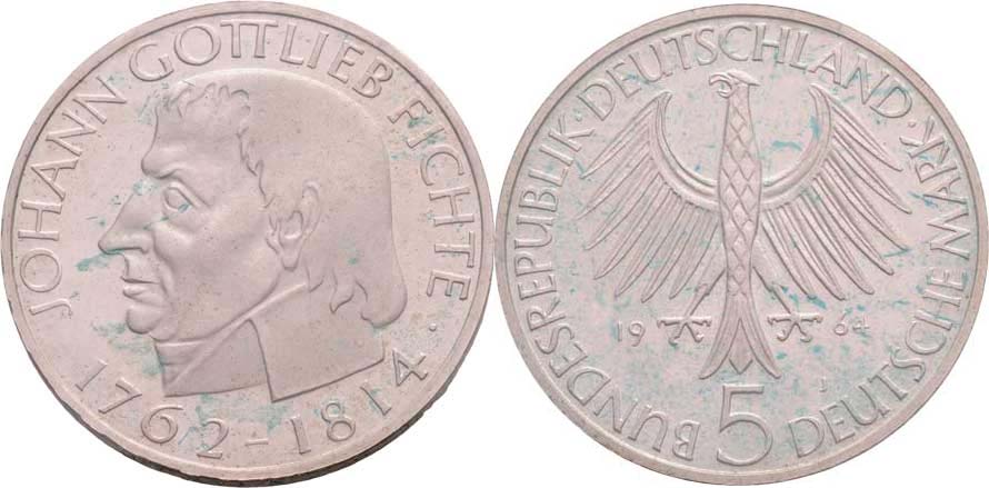 5 Marka 1964 J - Johann Gottlieb Fichte - s nápisem na hraně, KM.118.1 (Ag625, 11.20g), skvrnky, zataveno ve folii R!