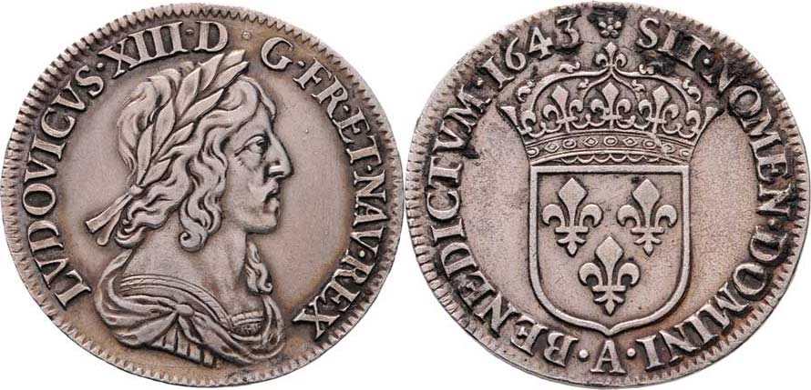1/4 Ecu 1643 A, Paříž, KM.134.1, 6.799g, nep.vady mater., dr.hr., skvrnky v reversu, patina R!