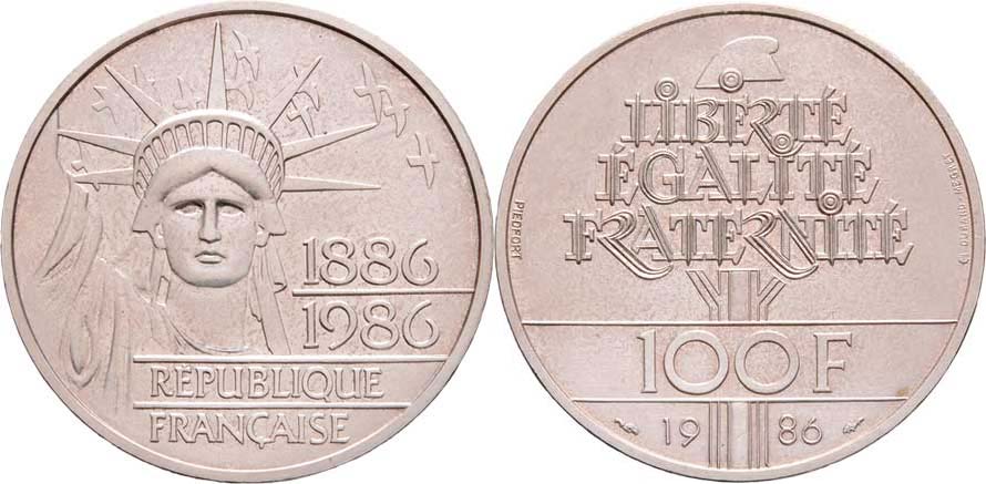 100 Frank 1986 - 100 let sochy Svobody - Piedfort (tlustý odražek, Ag900, pouze 5.000 ks), 29.964g, pěkná patina RR!