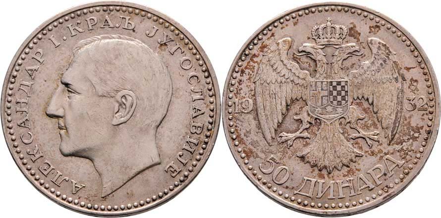 50 Dinár 1932 - bez značky mincovny, KM.16 (Ag750), 23.019g, dr.hr., dr.rysky, patina