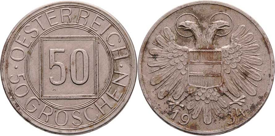50 Groš 1934 - tzv. Nachtschilling, KM.2850 (CuNi), 4.592g, nep.hr., nep.rysky, skvrny, patina R!