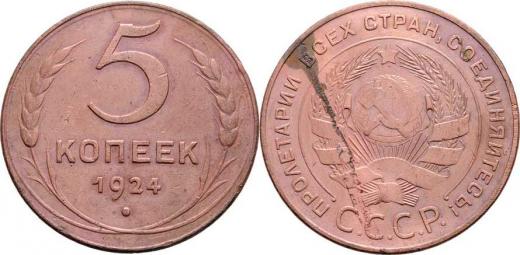 5 Kopějka 1924 - hladká hrana, Y.79, 16.458g, dr.hr., dr.rysky, vada materiálu, skvrnky