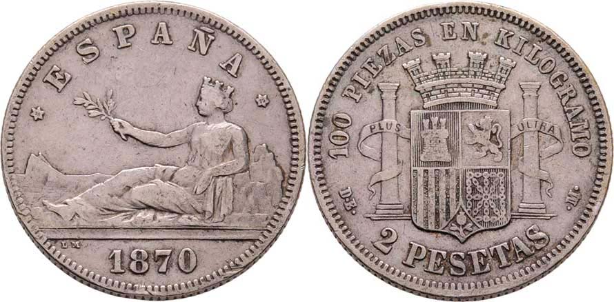 2 Peseta 1870/73 DE-M, Madrid, KM.654 (Ag835), 9.879g, dr.hr., dr.rysky, pěkná patina