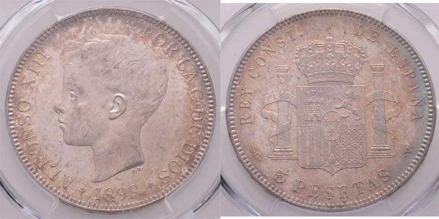 5 Peseta 1898/1898 SG-V, Madrid, KM.707, mince je zatavena v etui PCGS (uvedena zachovalost MS62), pat.