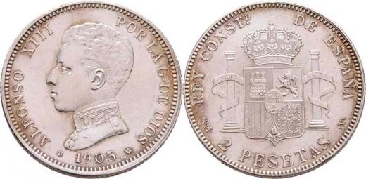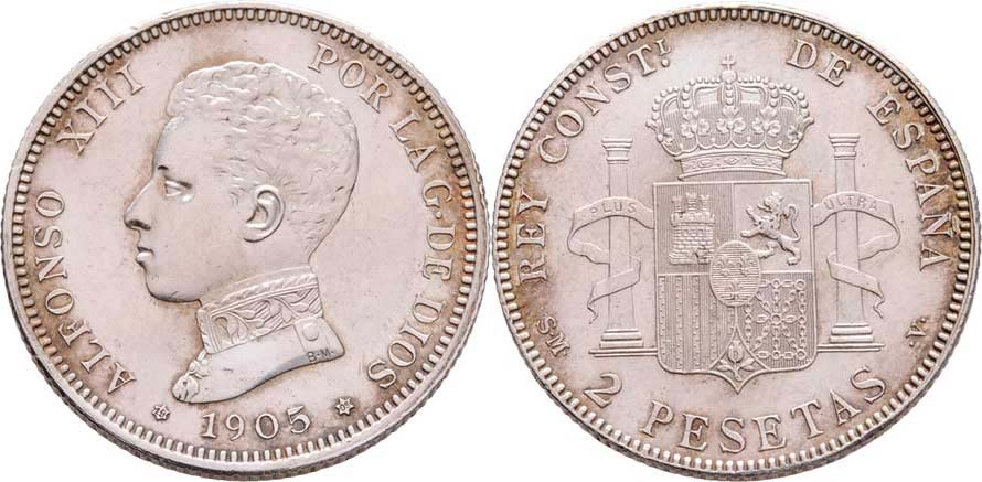 2 Peseta 1905/1905 SM-V, Madrid, KM.725 (Ag835), 10.117g, nep.hr., nep.rysky, pěkná patina, téměř