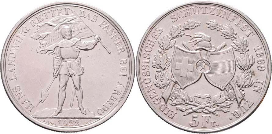 5 Frank střelecký 1869 - Zug, KM.S10 (Ag900, pouze 6.000 ks), 24.928g, nep.hr., vl.rysky, pěkná pat. R!