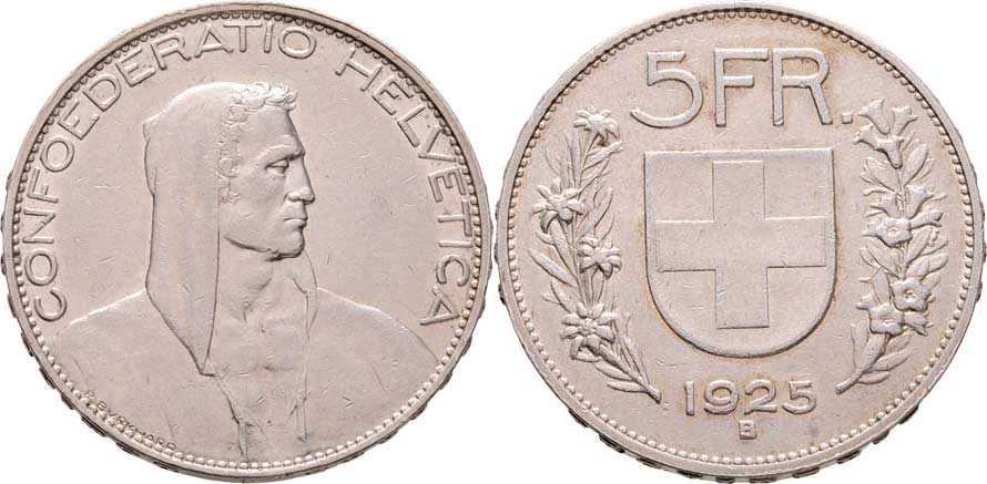 5 Frank 1925 B, Bern, KM.38 (Ag900), 24.961g, nep.hr., nep.rysky, pěkná patina