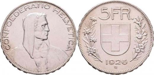 5 Frank 1926 B, Bern, KM.38 (Ag900), 25.008g, nep.hr., dr.rysky, pěkná patina