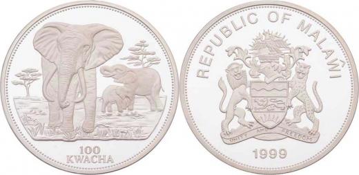 100 Kwacha 1999 - sloni, KM.neuvádí (patrně Ag999, 1000g), vl.rysky, kapsle RR!