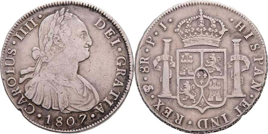8 Real 1807 PJ, Potosí, KM.73.1 (Ag896), 26.658g, vada materiálu na hraně, dr.rysky, pěkná patina R!