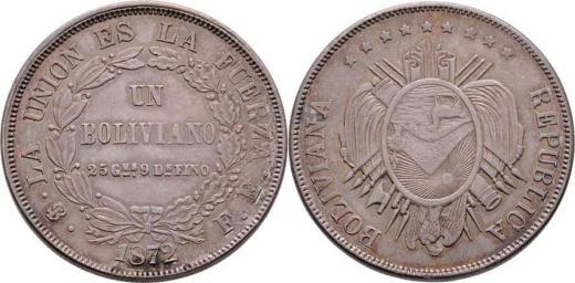 Boliviano 1872 PTS-FE, Potosí, KM.160.1, 24.719g, nep.nedor., nep.rysky, skvrnka, patina