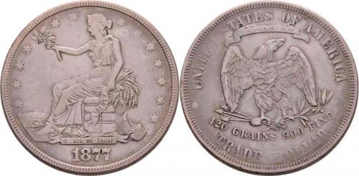 Obchodní dolar 1877, KM.108 (Ag900), 27.075g, nedor., dr.hr., dr.rysky, patina