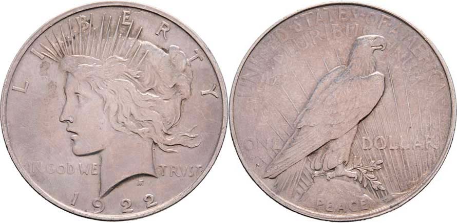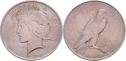 Dolar 1922 D - Mírový, KM.150 (Ag900), 26.737g, nep.hr., vlas.poškrábaný, rysky, patina