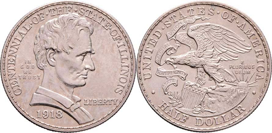 1/2 Dolar 1918 - Lincoln - 100 let státu Illinois, KM.143 (Ag900), 12.443g, nep.hr., nep.rysky, téměř
