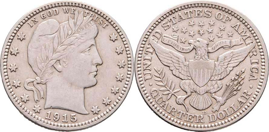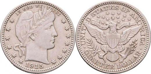 1/4 Dolar 1915 D - Barber, KM.114 (Ag900), 6.210g, nep.hr., nep.rysky, pěkná patina