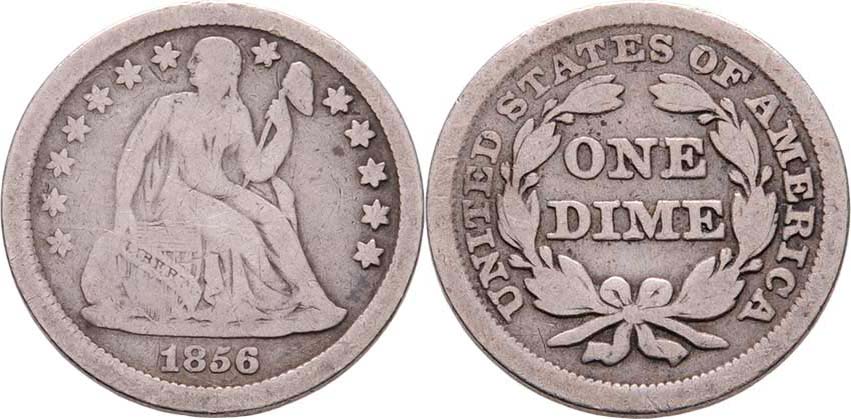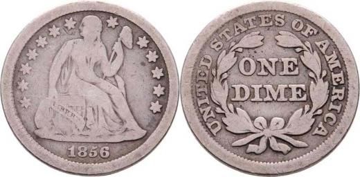 10 Cent 1856 - sedící Liberty, KM.A63.2 (Ag900), 2.301g, nep.hr., nep.rysky, pěkná patina
